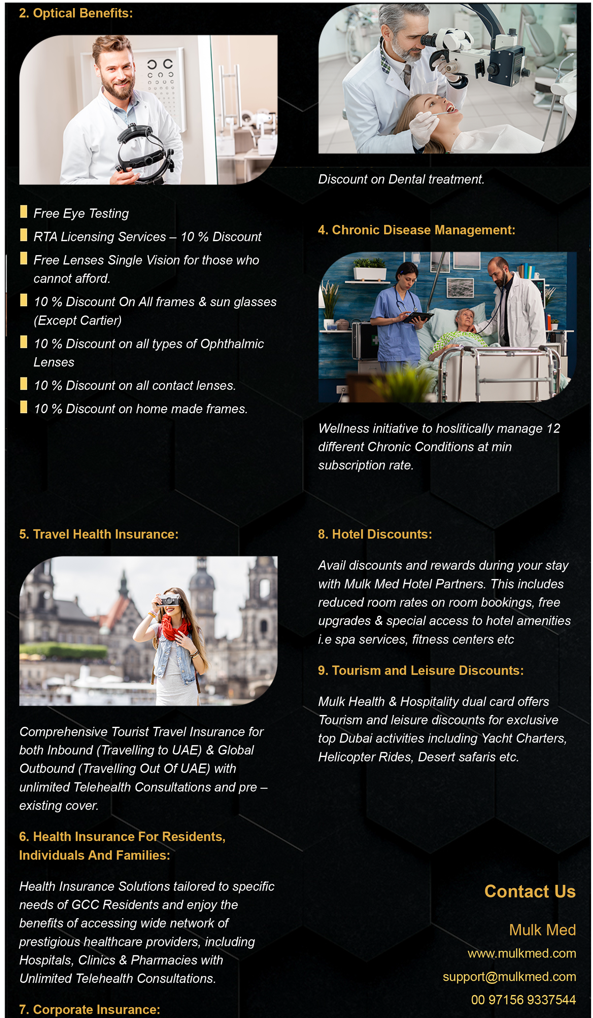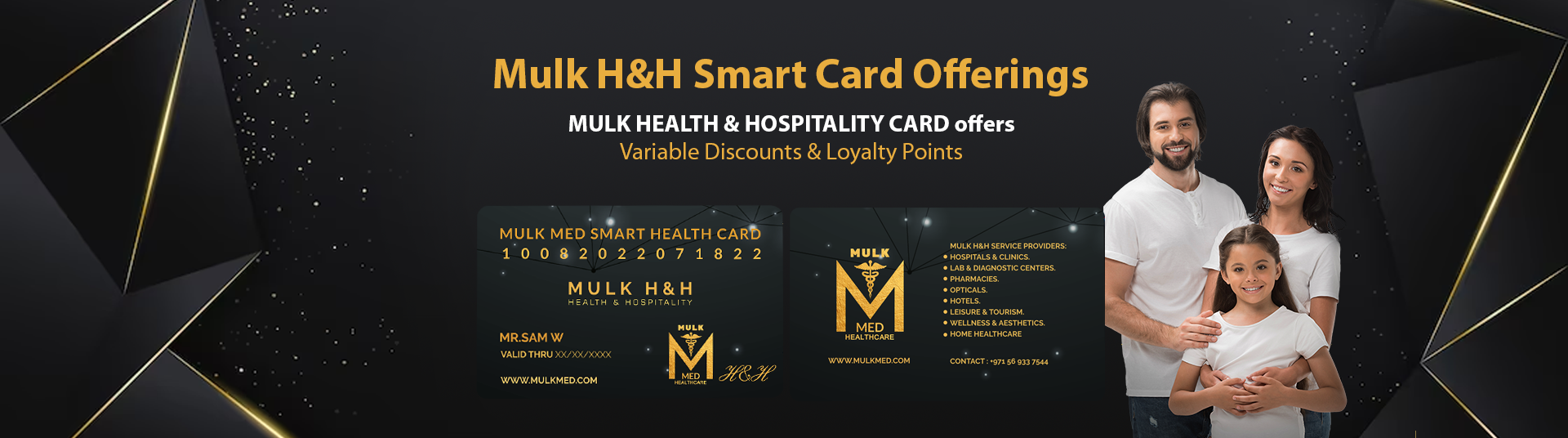The MulkMed privilege card is the first of its kind comprehensive patient discount card (healthcare saver card ), introduced by the innovative MulkMed team with our focus dedicated to provide a hassle free means to affordable and discounted healthcare services for all - from individuals to families, students and even tourists and visitors to the UAE. Recognizing the value for money and time without compromise to quality healthcare , we have created discounted healthcare offers and packages to suit various categories as listed on this site.